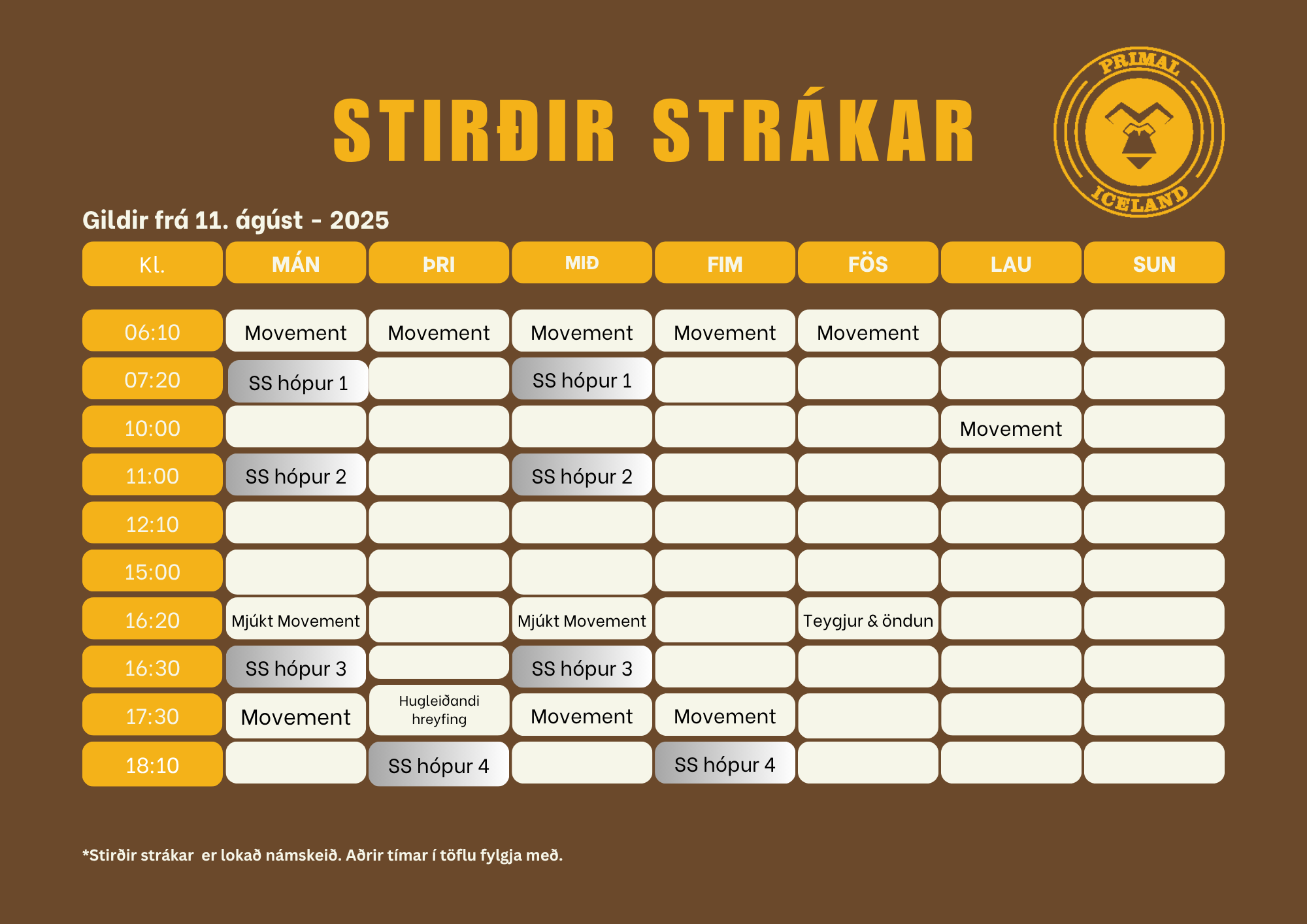Stökum mánuði og 12 vikna bindingu fylgir aðgangur að morgun og seinniparts Movement tímum Primal skv. tímatöflu.